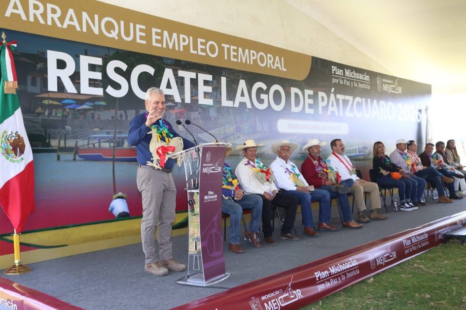*Erongarícuaro, Michoacán, 1 de marzo de 2026.-* El gobernador Alfredo Ramírez Bedolla dio arranque al programa de mil empleos temporales para habitantes de comunidades de los cuatro municipios ribereños, como parte de los trabajos de restauración y preservación del lago de Pátzcuaro.