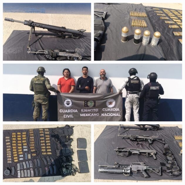 Se trata de Roberto “N”, alias El Maquinitas; Manuel “N”, alias El Many; y Roberto “N”, alias El 18, a quienes, tras una revisión por parte de los elementos del Ejército Mexicano, Guardia Nacional y Guardia Civil, les fueron aseguradas 6 armas largas, 20 cargadores, 327 cartuchos útiles, ocho granadas de fragmentación calibre .40, una motocicleta y un vehículo rzr Polaris.