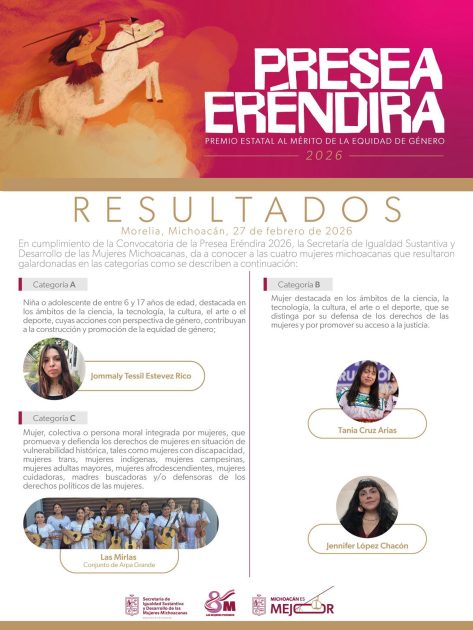 *Morelia, Michoacán, 27 de febrero de 2026.-* La Secretaría de Igualdad Sustantiva y Desarrollo de las Mujeres Michoacanas (Seimujer) dio a conocer a las ganadoras de la Presea Eréndira 2026, reconocimiento estatal al mérito de la equidad de género que distingue a niñas, adolescentes, mujeres y colectivas cuyas acciones contribuyen a la transformación social y a la defensa de los derechos humanos de las mujeres en el estado.